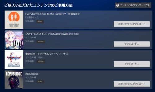購入 PS4,Everybody's Gone to the Rapture -幸福な消失-,864 PSVita,IA/VT -COLORFUL-,1512 PSVita,聖剣伝説 -ファイナルファンタジー外伝-,960 PS4,Republique,648 サマーセールで購入した物達。 聖剣伝説とEverybody's Gone to the Raptureは買うと決めて…